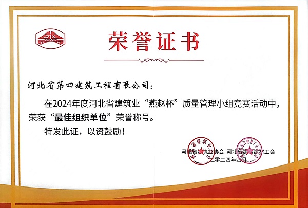 4月18日至20日,在河北省建筑业协会举办的2024年度河北省建筑业“燕赵杯”质量管理小组竞赛活动中,公司参赛的16项成果全部获奖,公司获“最佳组织单位”荣誉称号。